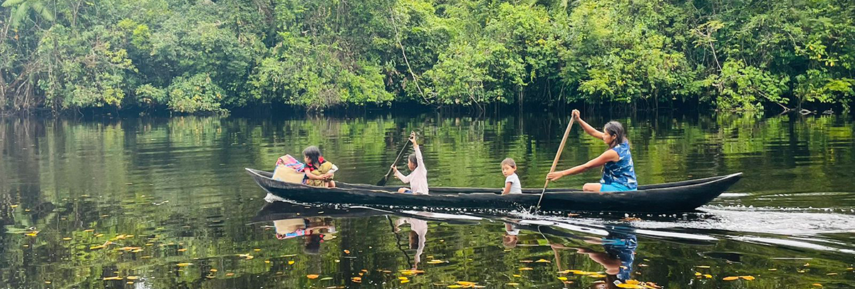 A Venezuelan family in Guyana travels by canoe to collect humanitarian assistance distributed by PADF and its partners.